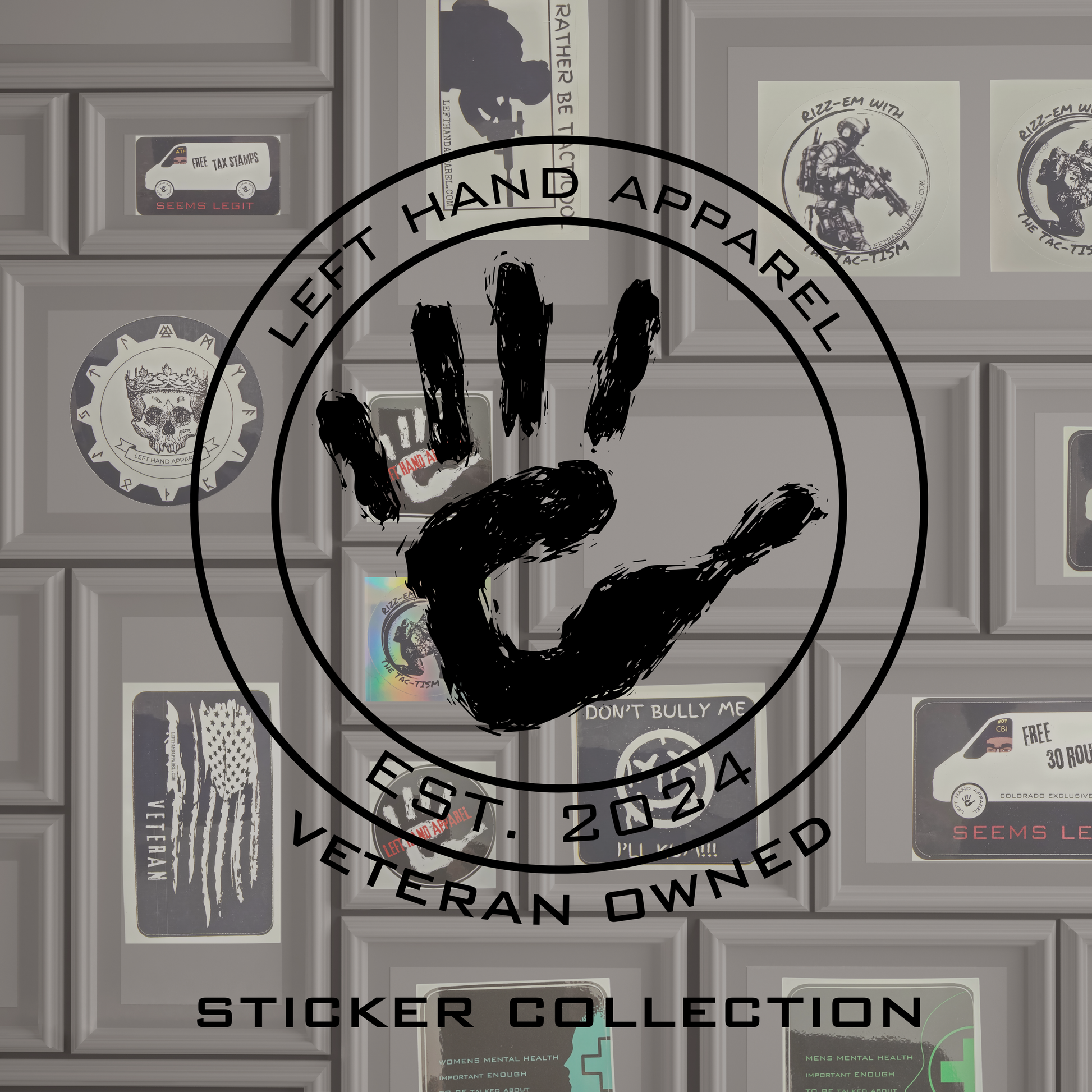 Introducing the Left Hand Apparel Sticker Collection. Elevate your style with our unique collection of stickers. Made of high-quality materials, these stickers are perfect for personalizing your belongings and showing off your love for Left Hand Apparel. Add a touch of individuality to your life with these stickers.